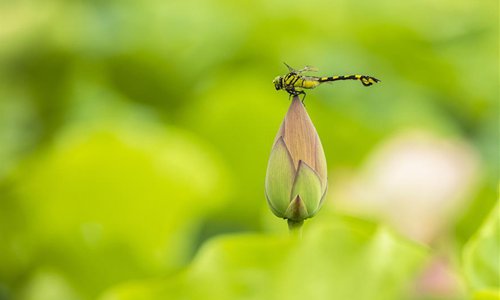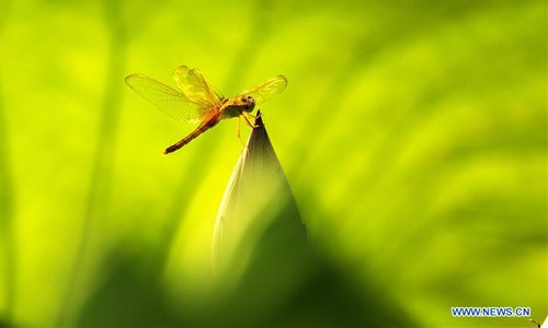 A dragonfly perches on a lotus flower in Liulang Township, Wuhu County of east China's Anhui Province, June 9, 2019. (Photo: Xinhua)