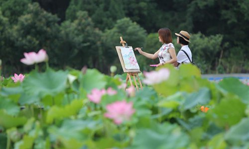 A tourist paints lotus flowers in Xiwan Village, Yongzhou City of central China's Hunan Province, June 9, 2019. (Photo: Xinhua)