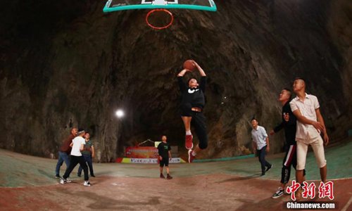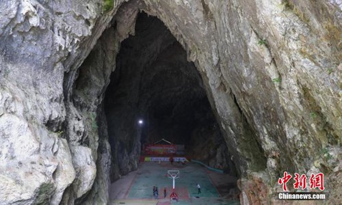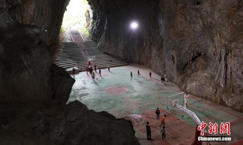 A view of a basketball court built inside a Karst cave in Xinchun Village, Nayong County, Guizhou Province. The basketball court was built with governmental subsidies as well as donations from local residents. It opened last December after it was equipped with an auditorium. (Photo: China News Service)