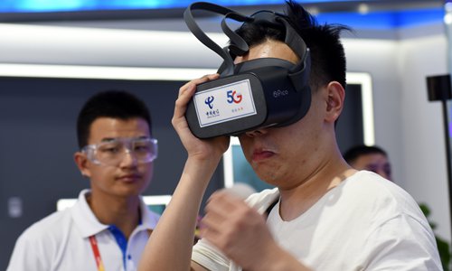 A tourist tries 5G data equipment at an experience hall during the international horticultural exhibition held in Beijing on Sunday. China's telecom industry regulator officially released the first 5G business licenses to China Mobile, China Union, China Telecom and China Broadcast Network on Thursday, helping the country enter the fast lane in commercializing the next generation of wireless technologies. Photo: IC