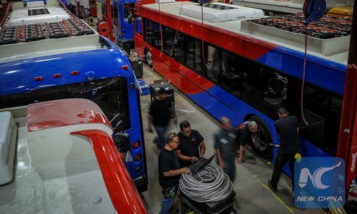 File photo taken on Sept. 23, 2016 shows people working at a BYD electric vehicle plant in Lancaster, California, the United States. Chinese carmaker BYD's coach and bus vehicle plant in Lancaster, which covers eight thousand square meters and is able to deliver three hundred zero-emission vehicles every year, has already employed more than three hundred people for production and customer service. (Photo: Xinhua)