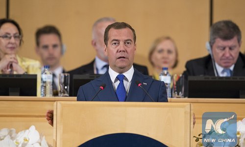 Russian Prime Minister Dmitry Medvedev delivers a speech during the International Labour Organization (ILO)'s annual International Labour Conference in Geneva, Switzerland, June 11, 2019. (Photo: Xinhua)