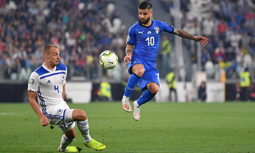 Italy striker Lorenzo Insigne (right) in action during the UEFA Euro 2020 qualifier between Italy and Bosnia and Herzegovina on Tuesday in Turin Photo: VCG