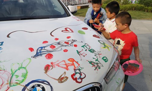Children are invited to draw on a white BMW as part of a car dealer's promotion on Saturday in Heze, East China's Shandong Province. Photo: VCG