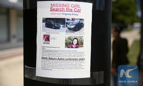 File photo taken on July 1, 2017 shows a poster about Yingying Zhang in the place where she was kidnapped by the suspect in Champaign, Illinois, the United States. (Photo: Xinhua)