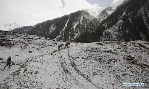 A nomad leads horses after a snowfall in Sonmarg, outskirts of Srinagar, the summer capital of Indian-controlled Kashmir, June 12, 2019. (Photo: Xinhua)