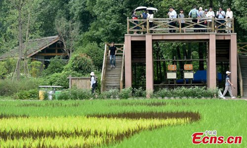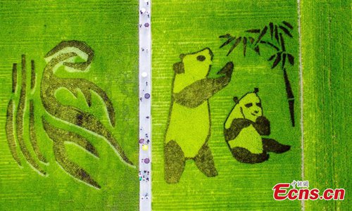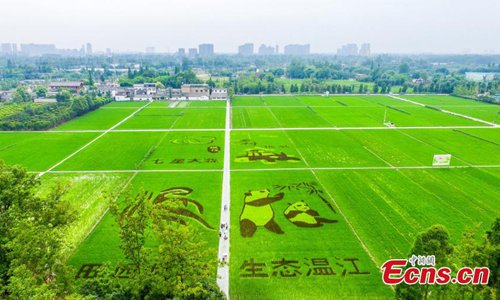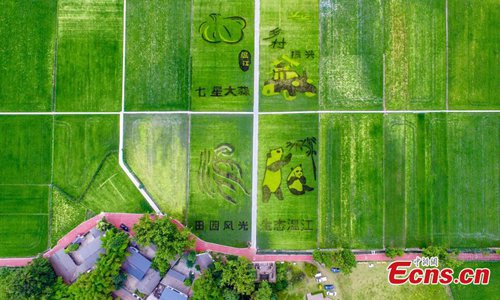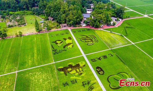 An aerial view of patterns featuring giant pandas, the local specialty garlic and Chinese characters in a rice paddy field in Wenjiang District, Chengdu City, Sichuan Province, June 10, 2019. (Photo: China News Service)