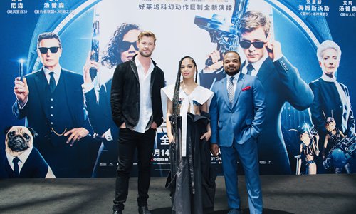 From left: Actor Chris Hemsworth, actress Tessa Thompson and director F. Gary Gray attend a Men in Black: International event in Beijing on Sunday. Photo: IC