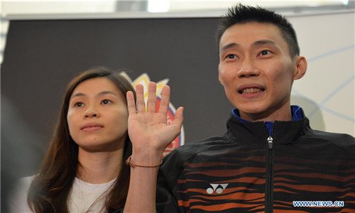 Malaysia's badminton player Lee Chong Wei (L) reacts during a news conference to announce his retirement in Putrajaya, Malaysia, June 13, 2019. (Xinhua/Chong Voon Chung)