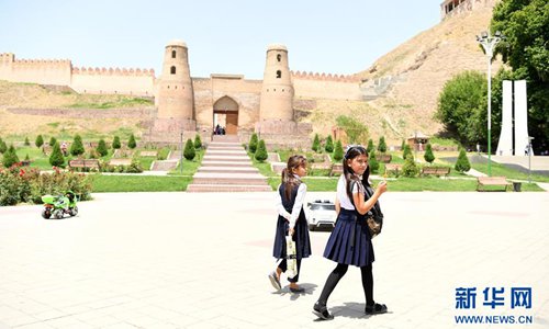 Two students walk past the Hisor Fortress, west of Dushanbe, Tajikistan, on June 12, 2019. Photo: Xinhua