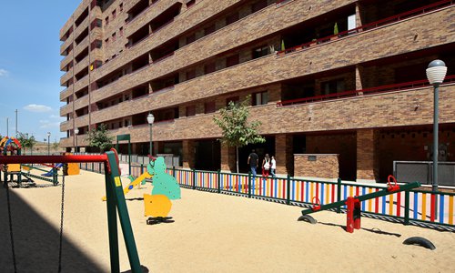 People pass by a playground in front of a nearly empty apartment building in Sesena, 32 kilometers south of Madrid, Spain. Photo: VCG