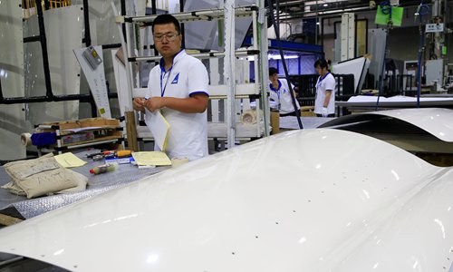 A worker makes plane parts inside a Boeing plant in North China's Tianjin Municipality. File photo: VCG