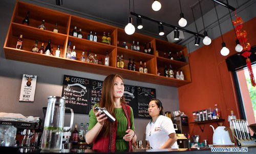 Takyrbasheva Asel (L), a student from Kyrgyzstan, works at a coffee shop during her spare time in Hainan University in Haikou, south China's Hainan Province, June 13, 2019. Kyrgyz girl Takyrbasheva Asel majors in Tourism Management in Hainan University. She has dedicated herself in experiencing the Chinese culture, including the learning of traditional Chinese musical instruments, Taiji and martial arts, and tea art since she came to China three years ago. She hoped she could stay in China after graducation and invite people from her hometown to come and experience the Chinese culture. Statistics showed that over 4,600 Kyrgyz students studied in China in 2018. (Xinhua/Guo Cheng)