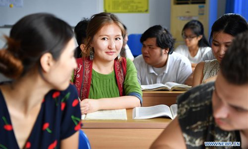 Takyrbasheva Asel, a student from Kyrgyzstan, talks with classmates in Hainan University in Haikou, south China's Hainan Province, June 13, 2019. Kyrgyz girl Takyrbasheva Asel majors in Tourism Management in Hainan University. She has dedicated herself in experiencing the Chinese culture, including the learning of traditional Chinese musical instruments, Taiji and martial arts, and tea art since she came to China three years ago. She hoped she could stay in China after graducation and invite people from her hometown to come and experience the Chinese culture. Statistics showed that over 4,600 Kyrgyz students studied in China in 2018. (Xinhua/Guo Cheng)