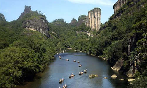 Tourists take bamboo rafts on the Jiuqu River at Wuyi Mountain scenic area in southeast China's Fujian Province, July 15, 2018. Located on the southeastern coast of China, Fujian Province is lying between mountains and the sea. Acting on the understanding that lucid waters and lush mountains are invaluable assets, Fujian in recent years has achieved great successes in terms of ecological development. The province has ranked China's No. 1 for 40 years with a forest coverage rate passing 67 percent. Besides high water quality, local residents also enjoy good air quality on over 95 percent of days in main cities of Fujian. Benefiting from its natural environment, Fujian keeps pioneering sustainable economy, mechanism invigoration, sound livability and good life. On June 13-15, the Beijing International Horticultural Exhibition exposes visitors to Fujian's sound livability and natural beauties with a Fujian Day theme event. (Xinhua/Qiu Ruquan)