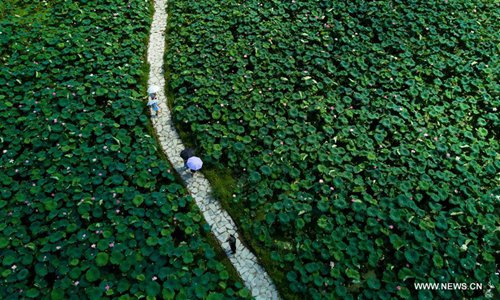 Aerial photo taken on July 8, 2018 shows tourists walking amid lotus flowers at Xiuzhu Village of Jianning County in Sanming City, southeast China's Fujian Province. Located on the southeastern coast of China, Fujian Province is lying between mountains and the sea. Acting on the understanding that lucid waters and lush mountains are invaluable assets, Fujian in recent years has achieved great successes in terms of ecological development. The province has ranked China's No. 1 for 40 years with a forest coverage rate passing 67 percent. Besides high water quality, local residents also enjoy good air quality on over 95 percent of days in main cities of Fujian. Benefiting from its natural environment, Fujian keeps pioneering sustainable economy, mechanism invigoration, sound livability and good life. On June 13-15, the Beijing International Horticultural Exhibition exposes visitors to Fujian's sound livability and natural beauties with a Fujian Day theme event. (Xinhua/Song Weiwei)