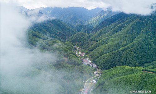 Aerial photo taken on April 10, 2019 shows Tongmu Village on Wuyi Mountain, southeast China's Fujian Province. Located on the southeastern coast of China, Fujian Province is lying between mountains and the sea. Acting on the understanding that lucid waters and lush mountains are invaluable assets, Fujian in recent years has achieved great successes in terms of ecological development. The province has ranked China's No. 1 for 40 years with a forest coverage rate passing 67 percent. Besides high water quality, local residents also enjoy good air quality on over 95 percent of days in main cities of Fujian. Benefiting from its natural environment, Fujian keeps pioneering sustainable economy, mechanism invigoration, sound livability and good life. On June 13-15, the Beijing International Horticultural Exhibition exposes visitors to Fujian's sound livability and natural beauties with a Fujian Day theme event. (Xinhua/Song Weiwei)