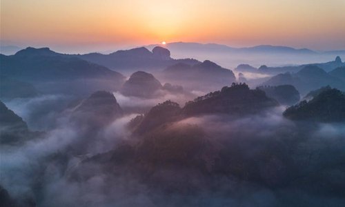 Aerial photo taken on March 12, 2019 shows a cloud scenery at sunrise in the Wuyi Mountain scenic spot, southeast China's Fujian Province. Located on the southeastern coast of China, Fujian Province is lying between mountains and the sea. Acting on the understanding that lucid waters and lush mountains are invaluable assets, Fujian in recent years has achieved great successes in terms of ecological development. The province has ranked China's No. 1 for 40 years with a forest coverage rate passing 67 percent. Besides high water quality, local residents also enjoy good air quality on over 95 percent of days in main cities of Fujian. Benefiting from its natural environment, Fujian keeps pioneering sustainable economy, mechanism invigoration, sound livability and good life. On June 13-15, the Beijing International Horticultural Exhibition exposes visitors to Fujian's sound livability and natural beauties with a Fujian Day theme event. (Xinhua/Song Weiwei)