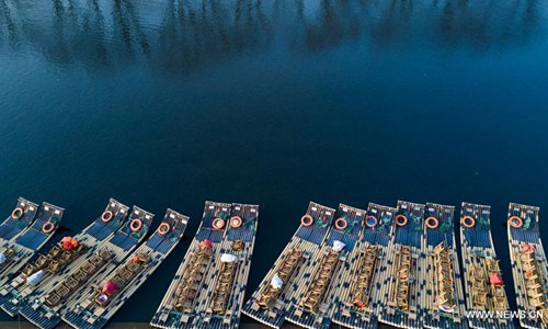 Aerial photo taken on March 11, 2019 shows bamboo rafts at Wuyi Mountain scenic spot in southeast China's Fujian Province. Located on the southeastern coast of China, Fujian Province is lying between mountains and the sea. Acting on the understanding that lucid waters and lush mountains are invaluable assets, Fujian in recent years has achieved great successes in terms of ecological development. The province has ranked China's No. 1 for 40 years with a forest coverage rate passing 67 percent. Besides high water quality, local residents also enjoy good air quality on over 95 percent of days in main cities of Fujian. Benefiting from its natural environment, Fujian keeps pioneering sustainable economy, mechanism invigoration, sound livability and good life. On June 13-15, the Beijing International Horticultural Exhibition exposes visitors to Fujian's sound livability and natural beauties with a Fujian Day theme event. (Xinhua/Song Weiwei)