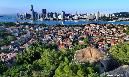 Aerial photo taken on Aug. 31, 2017 shows buildings on the Gulangyu island, southeast China's Fujian Province. Located on the southeastern coast of China, Fujian Province is lying between mountains and the sea. Acting on the understanding that lucid waters and lush mountains are invaluable assets, Fujian in recent years has achieved great successes in terms of ecological development. The province has ranked China's No. 1 for 40 years with a forest coverage rate passing 67 percent. Besides high water quality, local residents also enjoy good air quality on over 95 percent of days in main cities of Fujian. Benefiting from its natural environment, Fujian keeps pioneering sustainable economy, mechanism invigoration, sound livability and good life. On June 13-15, the Beijing International Horticultural Exhibition exposes visitors to Fujian's sound livability and natural beauties with a Fujian Day theme event. (Xinhua/Zhang Guojun)