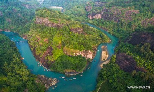Aerial photo taken on May 21, 2019 shows tourists taking bamboo rafts on Jiuqu River of Wuyi Mountain in southeast China's Fujian Province. Located on the southeastern coast of China, Fujian Province is lying between mountains and the sea. Acting on the understanding that lucid waters and lush mountains are invaluable assets, Fujian in recent years has achieved great successes in terms of ecological development. The province has ranked China's No. 1 for 40 years with a forest coverage rate passing 67 percent. Besides high water quality, local residents also enjoy good air quality on over 95 percent of days in main cities of Fujian. Benefiting from its natural environment, Fujian keeps pioneering sustainable economy, mechanism invigoration, sound livability and good life. On June 13-15, the Beijing International Horticultural Exhibition exposes visitors to Fujian's sound livability and natural beauties with a Fujian Day theme event. (Xinhua/Song Weiwei)