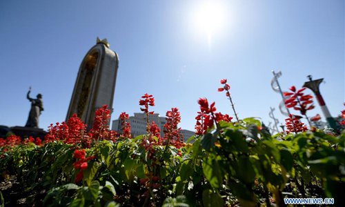 Staff members arrange flowers for a decorating parterre to greet the fifth summit of the Conference on Interaction and Confidence Building Measures in Asia (CICA) in Tajikistan's capital Dushanbe, June 13, 2019. (Xinhua/Sadat)