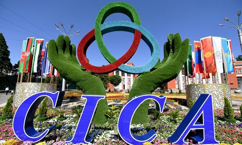The logo of the fifth summit of the Conference on Interaction and Confidence Building Measures in Asia (CICA) is seen in Tajikistan's capital Dushanbe, June 13, 2019. (Xinhua/Sadat)
