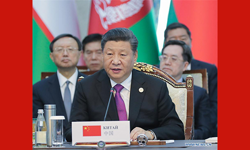 Chinese President Xi Jinping addresses the 19th meeting of the Council of Heads of State of the Shanghai Cooperation Organization (SCO) in Bishkek, Kyrgyzstan, June 14, 2019. (Xinhua/Yao Dawei)