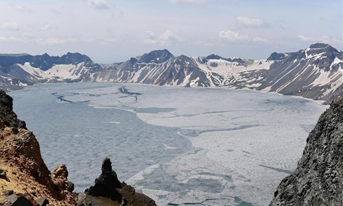 Photo taken on June 6, 2019 shows the frozen Tianchi Lake on Changbai Mountain in Northeast China's Jilin Province. With the temperature rising, Changbai Mountain Nature Reserve enters its tourism season. Many tourists from home and abroad come to enjoy its magnificent scenery and the view of Tianchi Lake. (Photo: Xinhua)