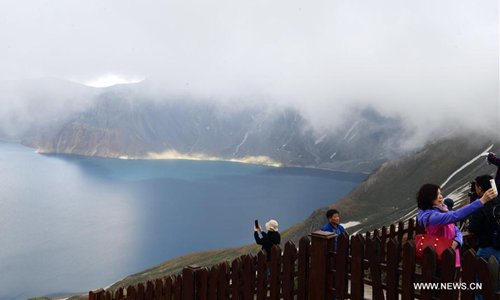People visit Tianchi Lake on Changbai Mountain in Northeast China's Jilin Province, June 14, 2019. With the temperature rising, Changbai Mountain Nature Reserve enters its tourism season. Many tourists from home and abroad come to enjoy its magnificent scenery and the view of Tianchi Lake. (Photo: Xinhua)