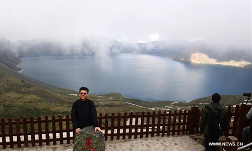 A tourist poses for photos at Tianchi Lake on Changbai Mountain in Northeast China's Jilin Province, June 14, 2019. With the temperature rising, Changbai Mountain Nature Reserve enters its tourism season. Many tourists from home and abroad come to enjoy its magnificent scenery and the view of Tianchi Lake. (Photo: Xinhua)