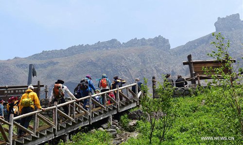 People visit Tianchi Lake on Changbai Mountain in Northeast China's Jilin Province, June 13, 2019. With the temperature rising, Changbai Mountain Nature Reserve enters its tourism season. Many tourists from home and abroad come to enjoy its magnificent scenery and the view of Tianchi Lake. (Photo: Xinhua)