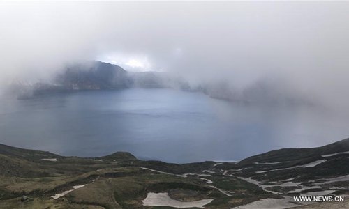 Photo taken on June 14, 2019 shows Tianchi Lake on Changbai Mountain shrouded in fog in Northeast China's Jilin Province. With the temperature rising, Changbai Mountain Nature Reserve enters its tourism season. Many tourists from home and abroad come to enjoy its magnificent scenery and the view of Tianchi Lake. (Photo: Xinhua)
