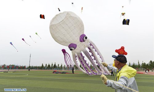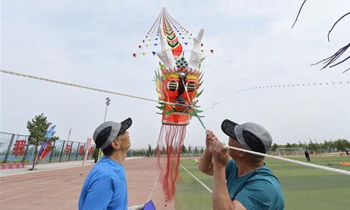 Participants fly a kite during a kite flying contest held in Baotou, north China's Inner Mongolia Autonomous Region, June 15, 2019. (Photo: Xinhua)