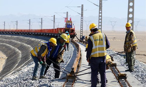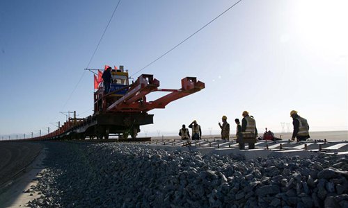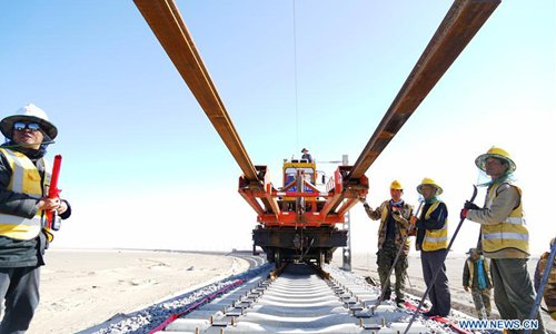 Workers lay tracks on the Dunhuang-Golmud Railway in Jiuquan City, Northwest China's Gansu Province, June 15, 2019. The last pair of 500-meter-long track were laid on the Dunhuang-Golmud Railway on Saturday, marking the completion of the track-laying work for the railway, which links Dunhuang in Northwest China's Gansu Province and Golmud, a city in Northwest China's Qinghai Province. (Photo: Xinhua)