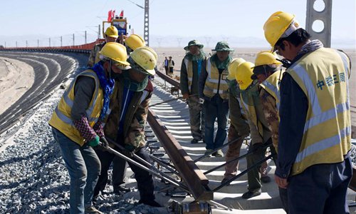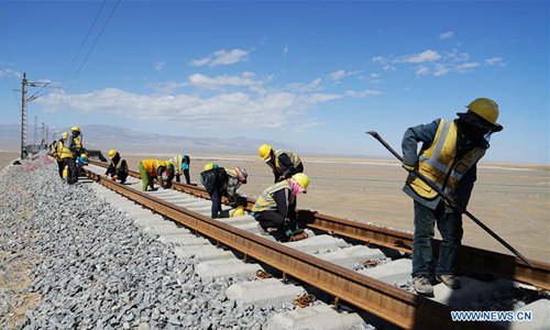 A worker lays track on the Dunhuang-Golmud Railway in Jiuquan City, Northwest China's Gansu Province, June 15, 2019. The last pair of 500-meter-long track were laid on the Dunhuang-Golmud Railway on Saturday, marking the completion of the track-laying work for the railway, which links Dunhuang in Northwest China's Gansu Province and Golmud, a city in Northwest China's Qinghai Province. (Photo: Xinhua)
