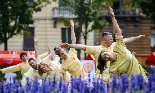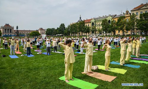 People practise yoga at King Tomislav Square in Zagreb, Croatia, on June 15, 2019. (Photo: Xinhua)