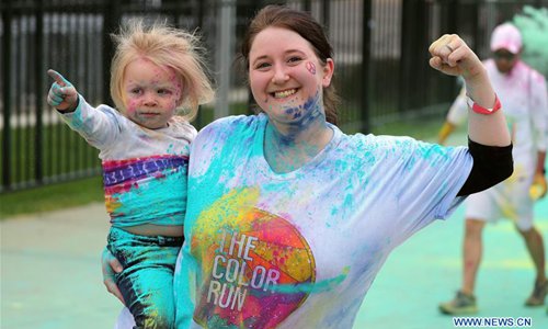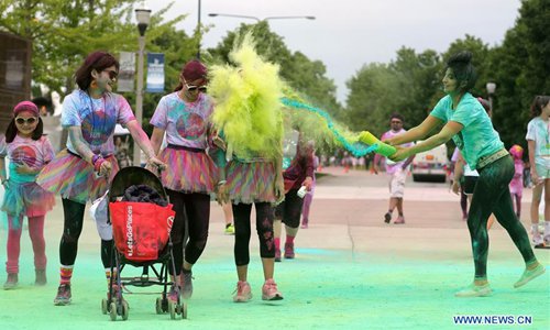 People participate in a color run event in Chicago, the United States, on June 15, 2019. The color run is a five-kilometer event with over one thousand participants this year. (Photo: Xinhua)