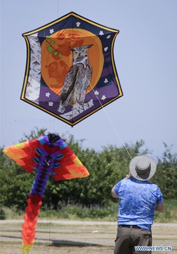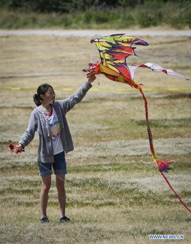 A woman flies a kite during the 44th Pacific Rim Kite Festival at Garry Point Park in Richmond, Canada, June 16, 2019. The festival attracted thousands of kite-flying enthusiasts and professional kite flyers. (Photo: Xinhua)