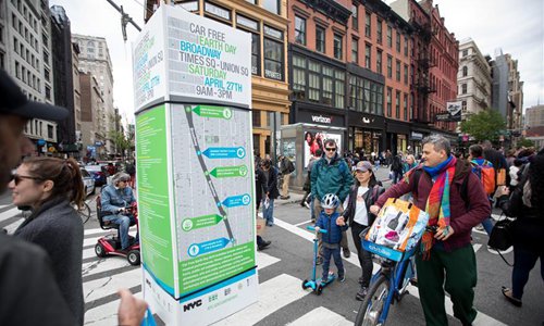 Pedestrians pass a map of the street closures on Broadway in New York, the United States, April 27, 2019. (Photo: Xinhua)
