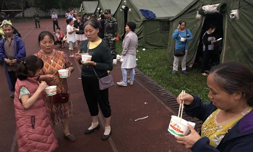 People have porridge at the playground of Changhe Town High School in Changning County of Yibin City, southwest China's Sichuan Province, June 18, 2019. Eleven people died and another 122 were injured after a 6.0-magnitude earthquake hit Changning County Monday night, the Yibin city government said early Tuesday. (Photo: Xinhua)