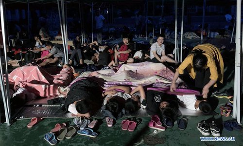 A teacher tucks students in bed at a tent in the playground of Shuanghe Town High School in Changning County of Yibin City, southwest China's Sichuan Province, June 18, 2019. Eleven people died and another 122 were injured after a 6.0-magnitude earthquake hit Changning County Monday night, the Yibin city government said early Tuesday. (Photo: Xinhua)