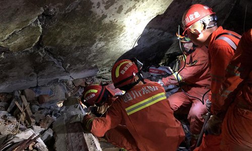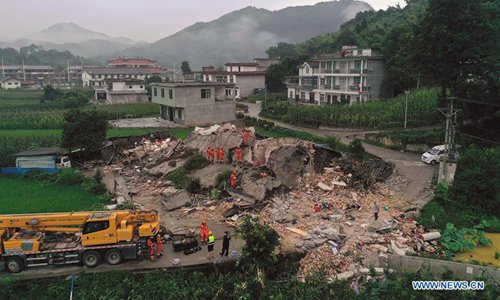 Rescuers work at Putao Village of Shuanghe Town in Changning County of Yibin City, southwest China's Sichuan Province, June 18, 2019. Eleven people died and another 122 were injured after a 6.0-magnitude earthquake hit Changning County Monday night, the Yibin city government said early Tuesday. (Photo: Xinhua)