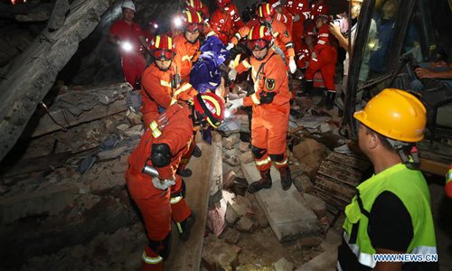 Rescuers search for trapped people in Shuanghe Town in Changning County of Yibin City, southwest China's Sichuan Province, June 18, 2019. Eleven people died and another 122 were injured after a 6.0-magnitude earthquake hit Changning County Monday night, the Yibin city government said early Tuesday. (Photo: Xinhua)