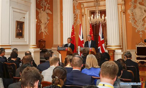 Chinese Vice Premier Hu Chunhua (L back) and British Chancellor of the Exchequer Philip Hammond attend a joint press conference after the 10th China-UK Economic and Financial Dialogue held in London, Britain, June 17, 2019. (Photo: Xinhua)