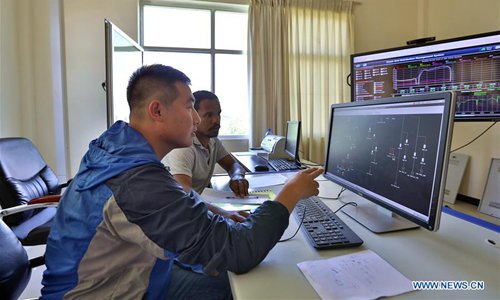 Guo Yongqiang, a staff member of China Electric Power Equipment and Technology Co., Ltd (CET), guides a local employee at the grid control center in Adama, Ethiopia, June 11, 2019. Steady power supply was acheived since a Chinese-built power distribution, rehabilitation and upgrading project involving 8 Ethiopian cities was put into operation in March 2019. (Photo: Xinhua)