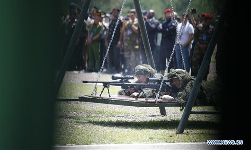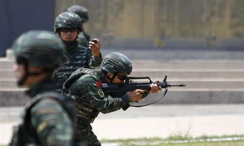 Chinese special operation soldiers take part in military training demonstrations during the Great Wall-2019 International Forum on Counter-terrorism in Beijing, capital of China, June 18, 2019. An international counter-terrorism forum hosted by China's armed police force opened in Beijing Tuesday. With the theme "special force sniping," the four-day event attracted more than 240 representatives from the military and police forces of 31 countries including China, France, Pakistan, Israel and Uzbekistan.(Photo: Xinhua)