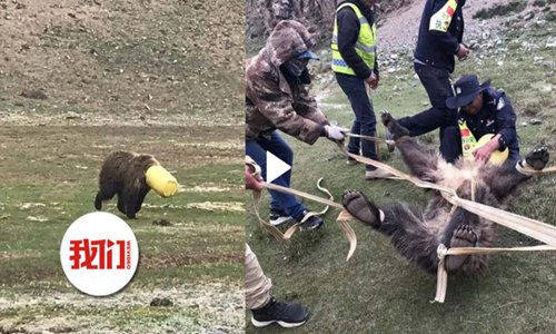 Police in the Yushu Tibetan Autonomous Prefecture, Northwest China's Qinghai Province help to pull out a plastic bucket from a brown bear's head. Photo: Screenshot of The Beijing News