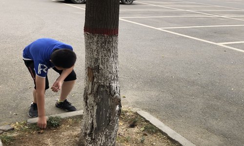 A primary school student in Xi'an, Northwest China's Shaanxi Province picks up cigarette butts to exchange ice cream. Photo: VCG