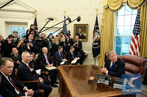 US President Donald Trump (1st right) meets with Chinese Vice Premier Liu He (2nd left, front) at the Oval Office of the White House in Washington, DC, the US, February 22. US President Donald Trump met with Chinese Vice Premier Liu He at the White House on bilateral ties and the ongoing bilateral trade talks. Photo: Xinhua